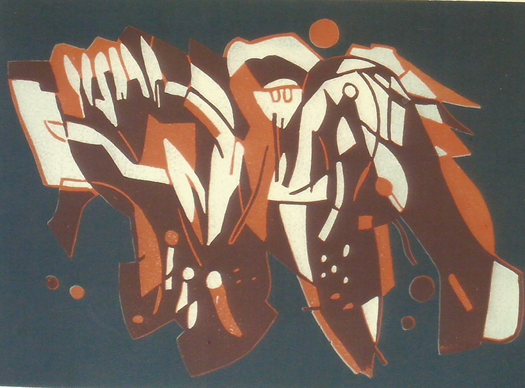 ERICH FREY arbeitet konsequent an seinen abstrahierten Bildern – oft in Form von Zeichnungen, Ölbildern, Schablonendrucken bis hin zu Linolschnitten.