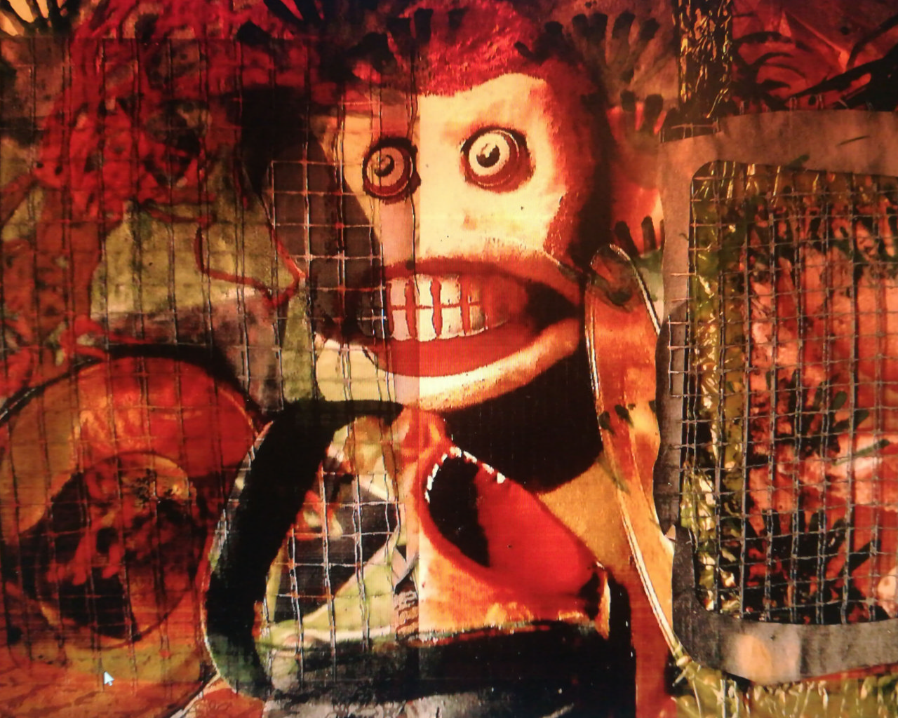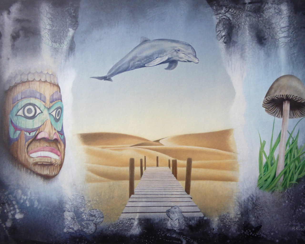 Witz, Ironie und Unergründliches spielen auch häufig eine Rolle in seinen Bildern. ‚Gefangen‘ ist der Titel des roten Bildes und ‚Traum‘ nennt sich das andere, das wir hier zeigen.